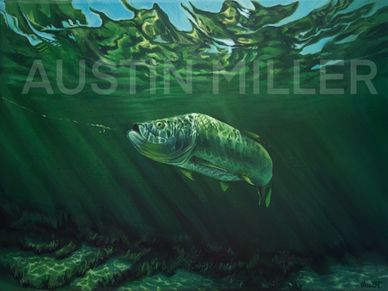 “Silver Drift” is a vivid underwater portrayal of a tarpon—one of the ocean’s most iconic and elusive game fish—gliding effortlessly through the filtered blue-green light of the shallows. Painted with acrylics on a 16x12 inch stretched canvas, this piece captures a single moment of calm within the energetic pulse of coastal marine life.