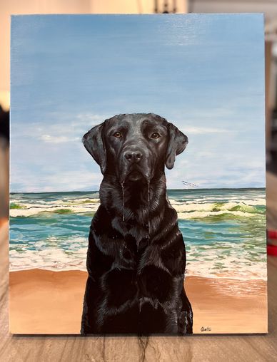 This custom portrait captures a black Labrador enjoying a quiet moment on the shore—honoring the bond between dog and owner with warm coastal tones and thoughtful detail.
