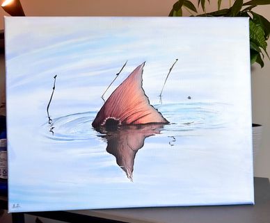 This custom painging captures a redfish flowing through a quiet moment in the flats—showing the grace of the calm flats with cool tones and thoughtful detail.