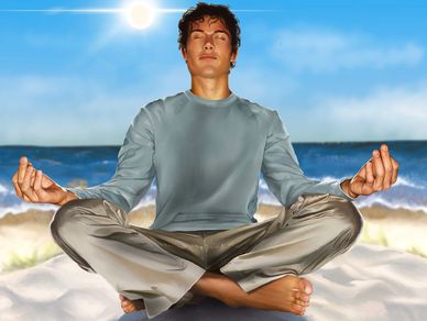 A serene moment captured in soft tones—a man in meditation, grounded in breath and balance as the ocean meets the sky. This piece reflects the quiet clarity found at the edge of the sea.